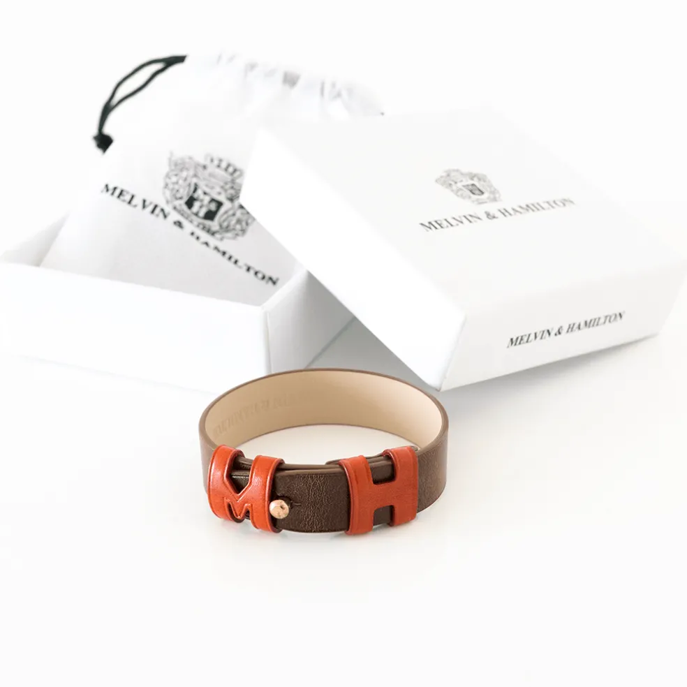 Chez Melvin & Hamilton nous avons ajouté un nouveau bracelet à notre collection : Archie. Fabriqué à partir d’un cuir tannage végétal, ce bracelet est léger, facile à mettre autour du poignet et peut se porter avec d’autres bracelets de la maison. Sa couleur marron accompagnée des initiales de la marque Melvin & Hamilton en orange, en font un produit à la fois classique et design. Moderne et intemporel, avec le bracelet Archie vous tenez la touche finale de votre tenue !