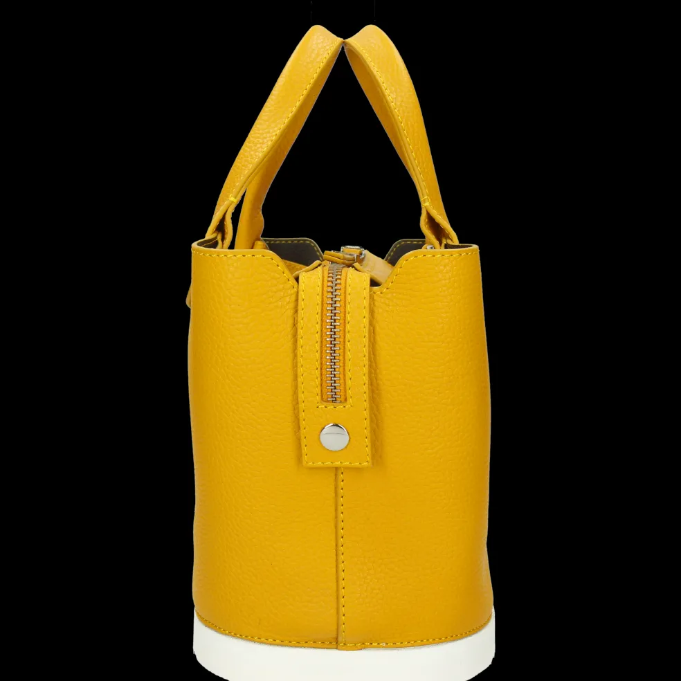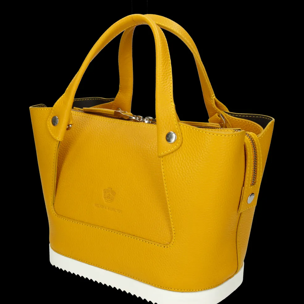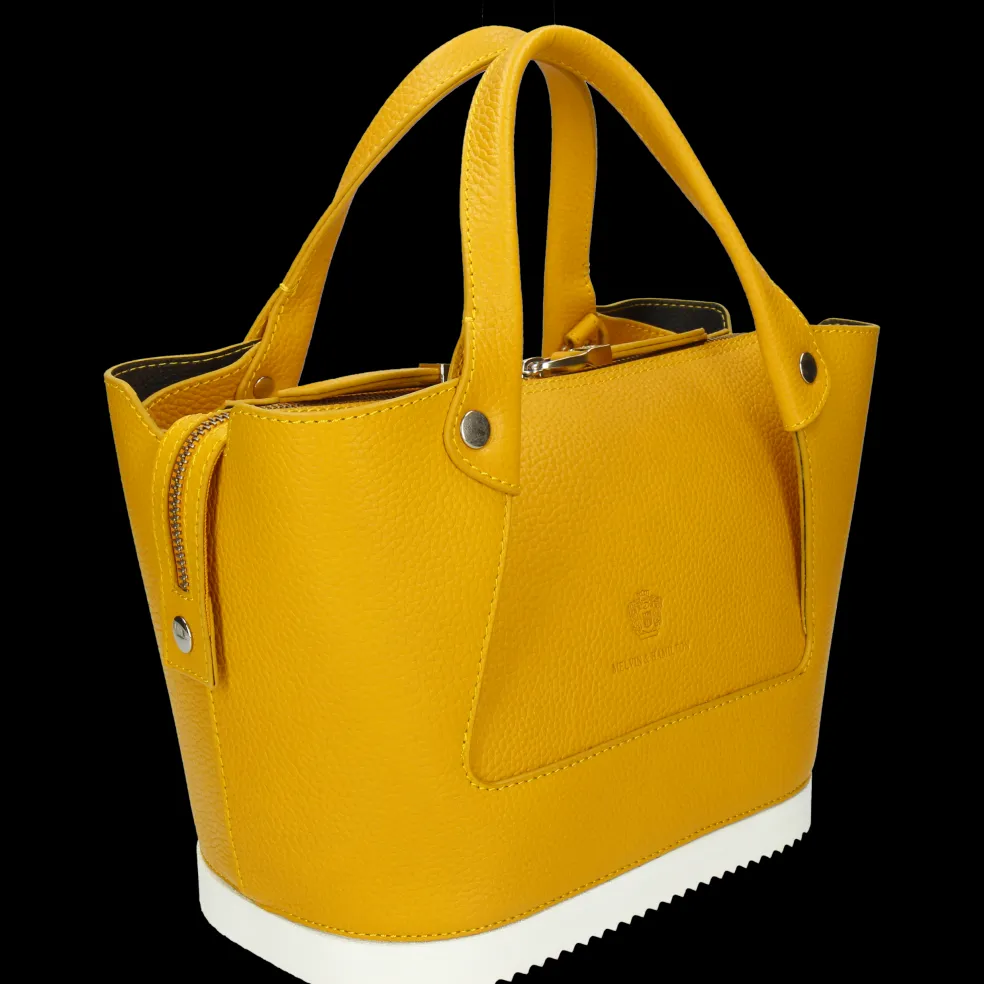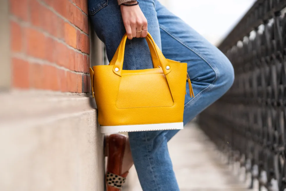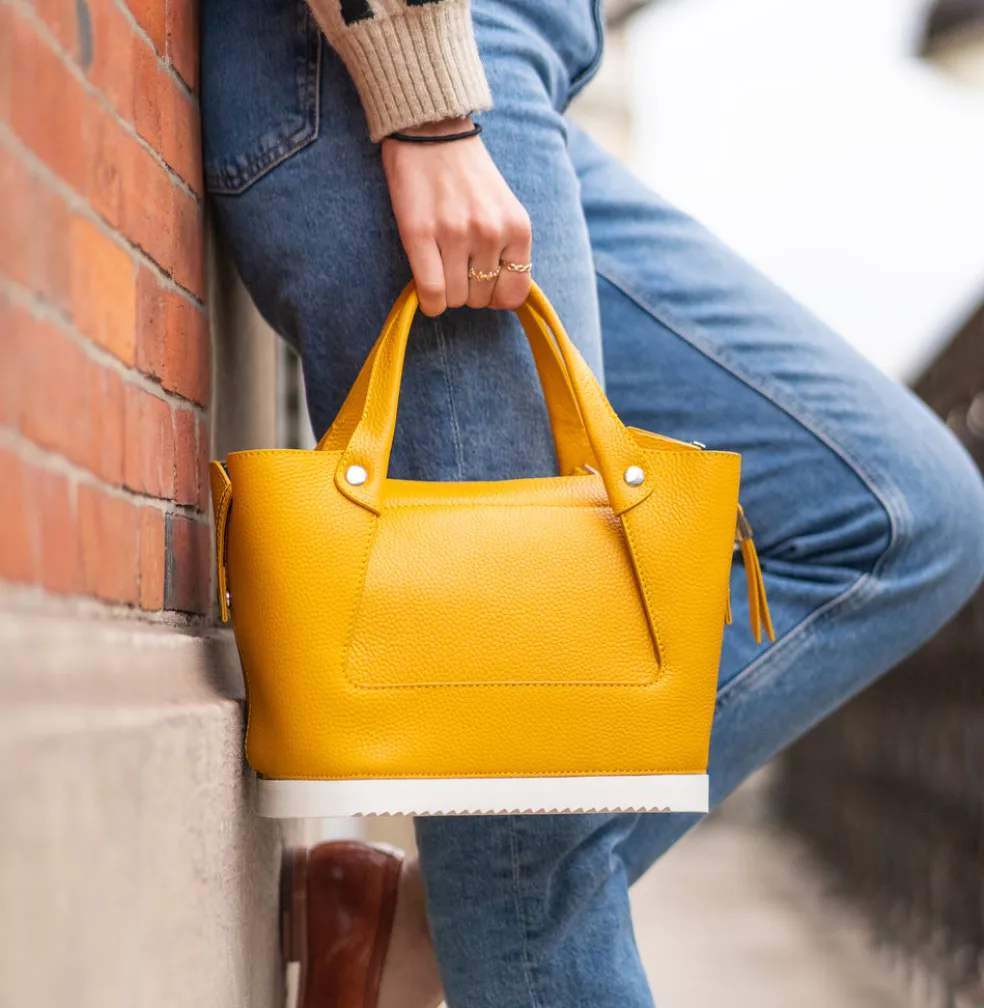 Vous cherchez un nouveau sac à main qui sorte de l’ordinaire ? Le sac à main Christine 1 en cuir jaune dessiné par Melvin & Hamilton est le choix idéal ! Compact mais suffisamment large pour y mettre de nombreux objets et effets personnels, il comporte également une pochette zippée à l’intérieur. Porté à la main ou en bandoulière grâce à sa sangle amovible en tissu noir, notre sac en cuir est résistant et s’adapte à toutes vos envies. Il se distingue par son côté esthétique et fashion, mais aussi par son originalité grâce à son fond qui rappelle la semelle en gomme des chaussures de la marque. Vous pourrez ainsi le poser par terre sans craindre d’abîmer le cuir. Christine apportera la touche chic et tendance à votre look !