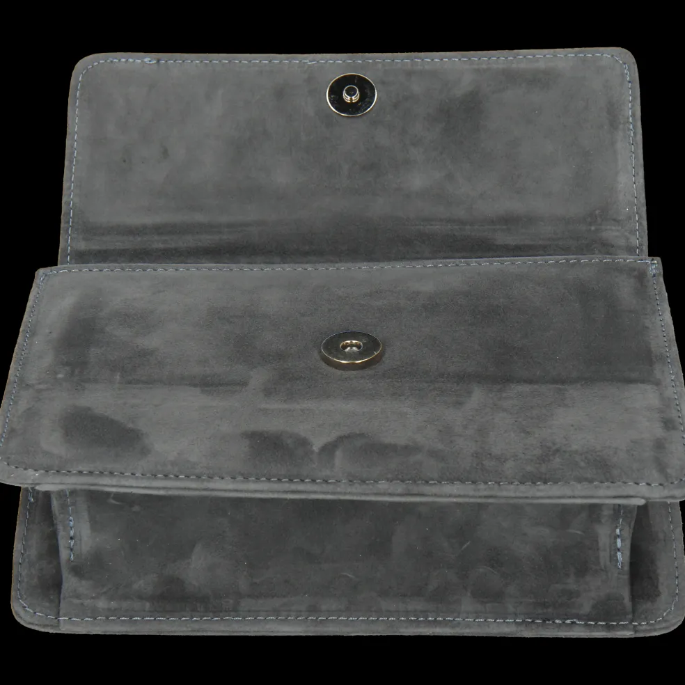 Melvin & Hamilton présente sa collection capsule exclusive en collaboration avec la marque italienne Fratelli Russo. Cette pochette décorée d’un fermoir magnétique orné d’un rectangle de cristaux est fabriquée en Italie. Le sac Franca en cuir suédé gris présente une couture ton sur ton pour une finition artisanale. La chaîne en métal vous permet de porter cette pochette également sur l’épaule.