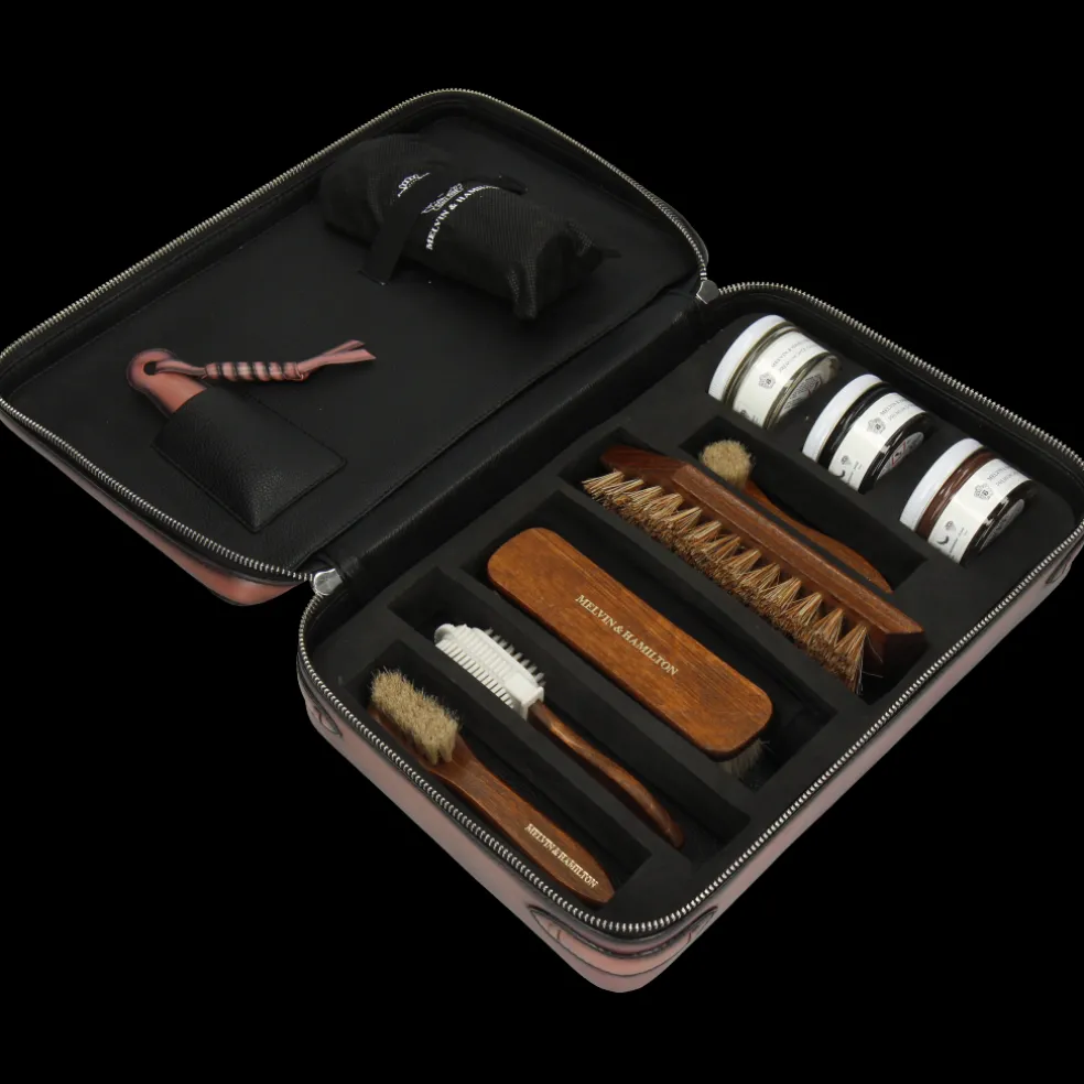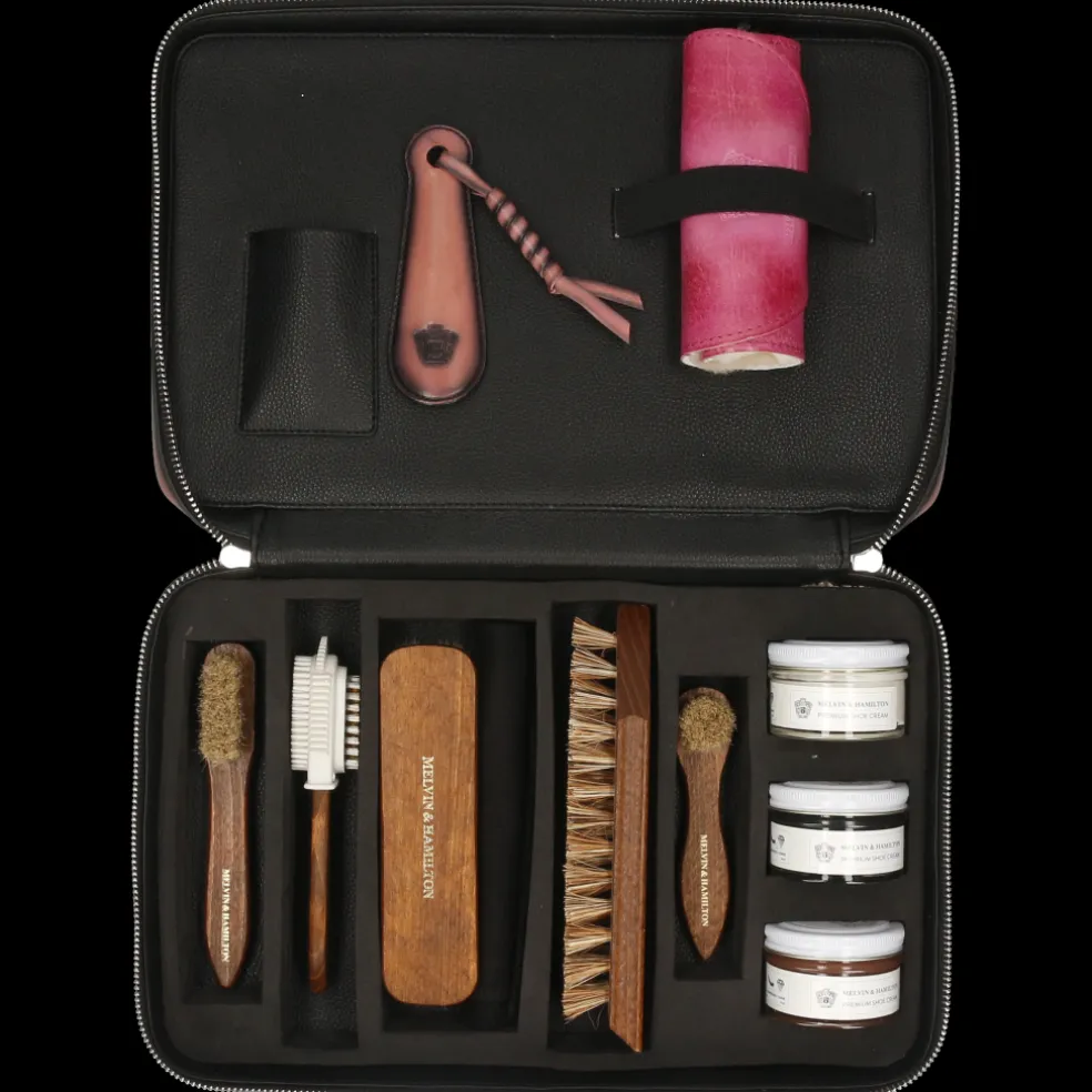 Posséder un coffret d’entretien des chaussures est un must-have pour les passionnés et connaisseurs qui apprécient le plaisir et l’élégance du rituel d’entretien du cuir. Notre coffret Gregory contient des produits et accessoires d’exception afin de réaliser un entretien complet du cuir dans les règles de l’art. Composé d’un chausse-pieds, d’un gant lustreur, de cinq brosses pour répondre à tous les cuirs et toutes les parties de la chaussure, ainsi que de trois crèmes de cirage personnalisables, ce kit d’entretien est le cadeau parfait à offrir à ceux qui ont un goût prononcé pour le soulier afin de compléter ou de renouveler leur collection de cirages et de brosses. Notre coffret répond aux critères habituels de la maison Melvin & Hamilton, à savoir une fabrication en cuir de veau tannage végétal.