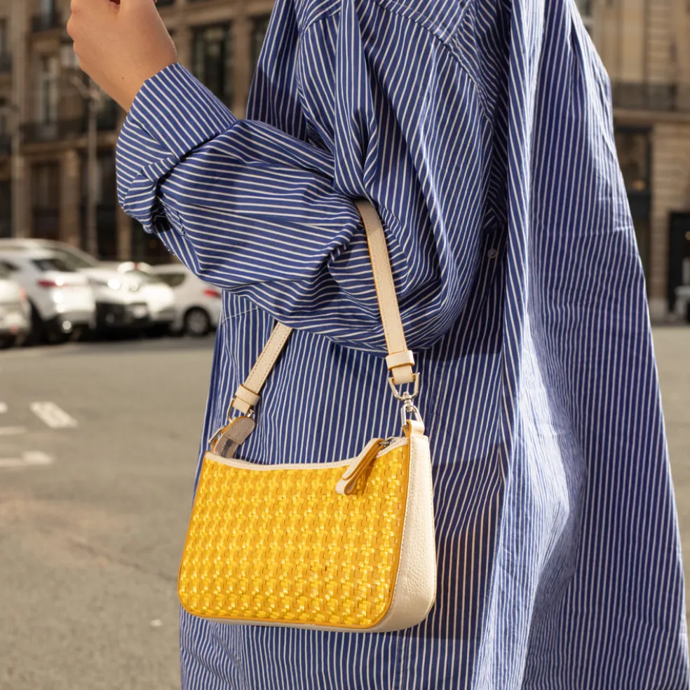 Vous cherchez un nouveau sac à main qui sorte de l’ordinaire ? Le sac baguette Maya en cuir tressé jaune dessiné par Melvin & Hamilton est le choix idéal ! Sa forme en fait le sac à main parfait pour une virée shopping. Porté à la main ou à l’épaule avec son anse en cuir, notre sac baguette est résistant grâce à la bande de cuir de qualité qui renforce les côtés et le dessous. Il se distingue par son côté esthétique et fashion et apportera la touche chic et tendance à votre look. Maya n’attend plus que vous !