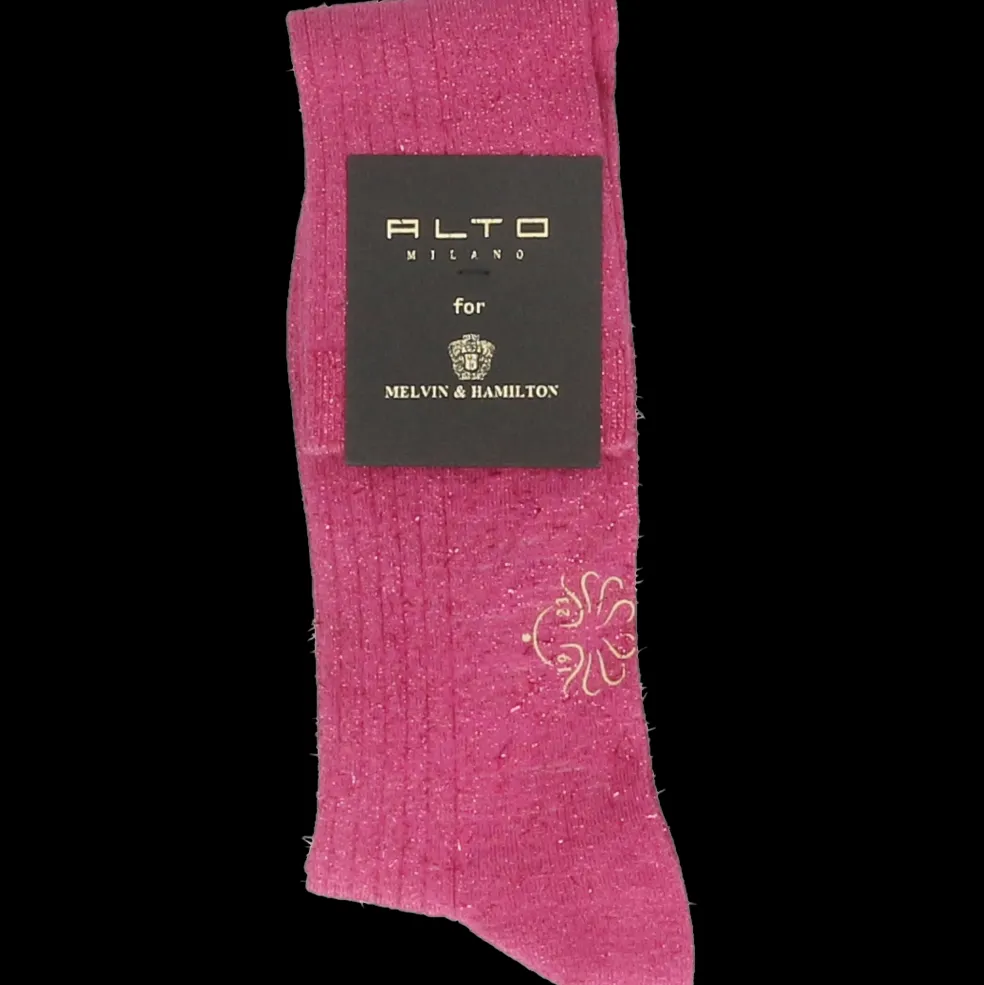 Craquez pour les chaussettes longues Menton en rose, leur coupe haute et leur design unique. Avec leur aspect à la fois côtelé et pailleté, ce modèle apportera la touche glamour et féminine pour parfaire votre look. Dessinées et fabriquées par Alto Milano pour Melvin & Hamilton, les chaussettes Menton sont constituées à 80% de coton, ce qui en fait une chaussette confortable et agréable au quotidien.