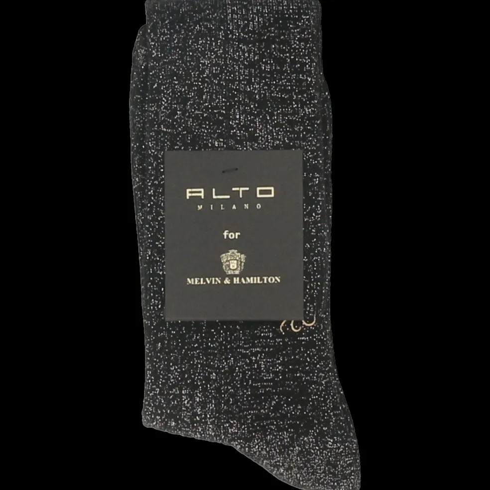 Craquez pour les chaussettes longues Menton en noir, leur coupe haute et leur design unique. Avec leur aspect à la fois côtelé et pailleté, ce modèle apportera la touche glamour et féminine pour parfaire votre look. Dessinées et fabriquées par Alto Milano pour Melvin & Hamilton, les chaussettes Menton sont constituées à 80% de coton, ce qui en fait une chaussette confortable et agréable au quotidien.