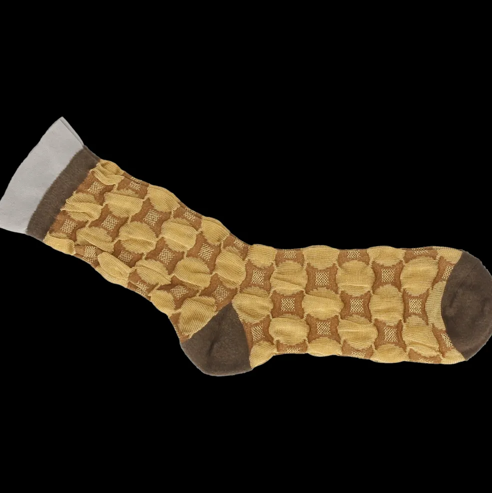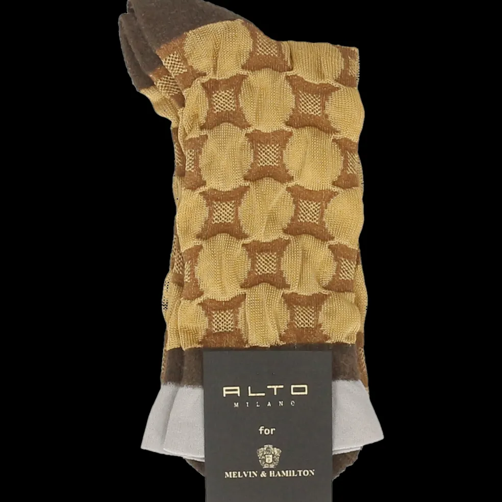 Les chaussettes mi-longues Agde en doré séduisent par leur design simple aux motifs géométriques, pour une touche originale à vos pieds. Dessinées et fabriquées par Alto Milano pour Melvin & Hamilton, l’excellence de la fabrication italienne vous assure une qualité supérieure. En viscose à 78%, ces chaussettes mi-hautes sont fines et confortables, et grâce à leur taille unique elles s’adaptent parfaitement à votre pied et dureront longtemps.