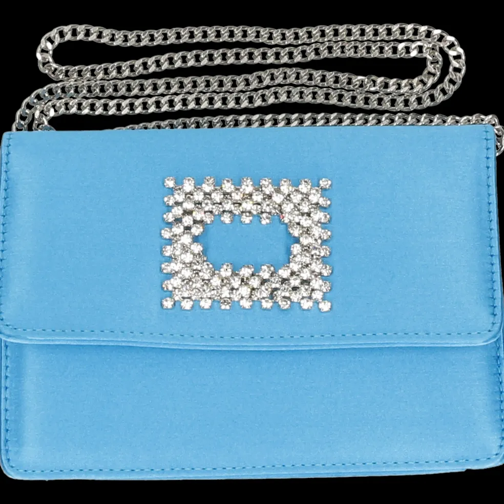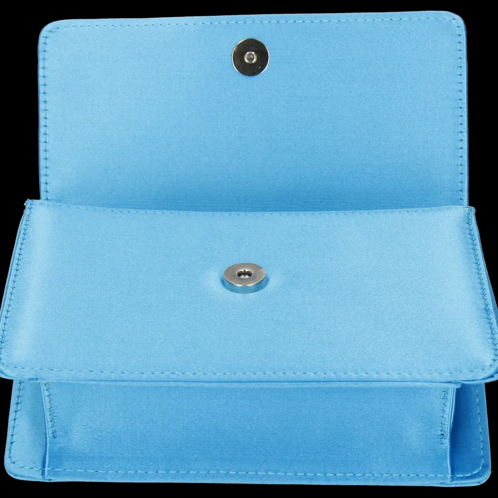 Melvin & Hamilton présente sa collection capsule exclusive en collaboration avec la marque italienne Fratelli Russo. Cette pochette décorée d’un fermoir magnétique orné d’un rectangle de cristaux est fabriquée en Italie. Les coutures ton sur ton apportent une finition artisanale au sac à main Franca en satin turquoise. La chaîne en métal vous permet de porter cette pochette également sur l’épaule.