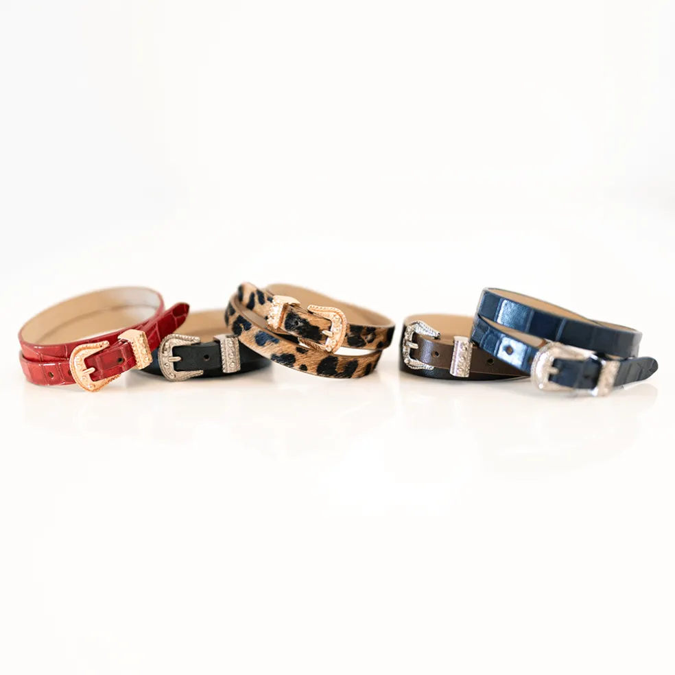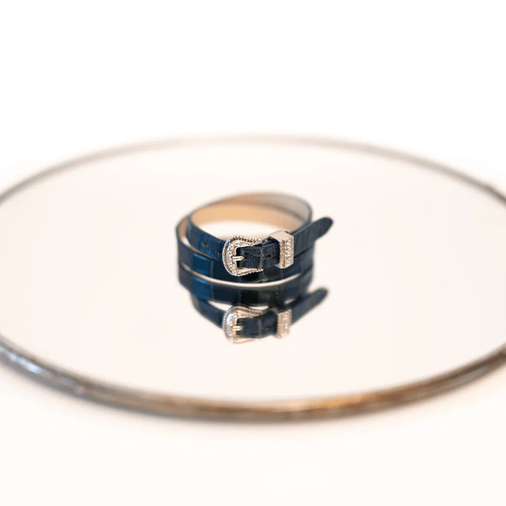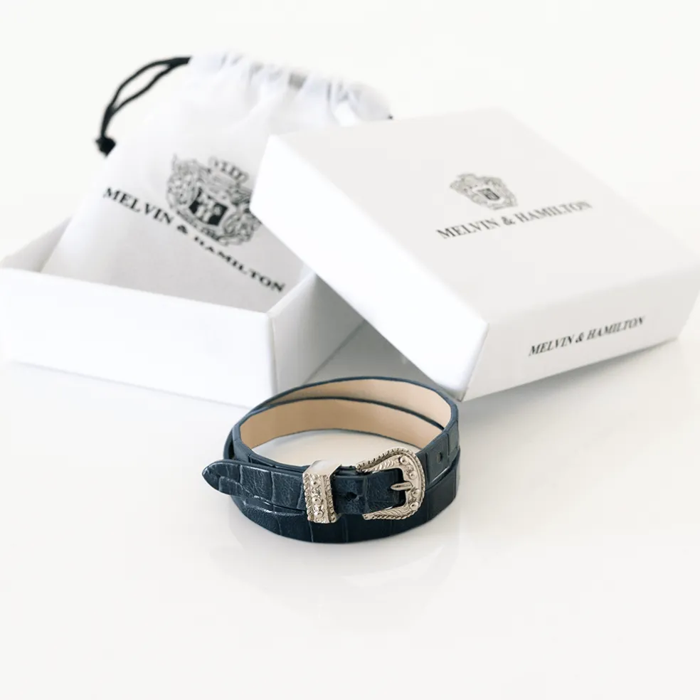 Chez Melvin & Hamilton, nous aimons développer des accessoires en cuir de haute qualité ! Notre dernière création : le double bracelet pour femme Ines dans un look imprimés sauvages. Original et coloré, le bracelet Ines en cuir bleu foncé imitation croco est un modèle casual chic qui s’adaptera à tous les tours de poignets. Le fermoir en argent apporte une touche moderne à ce bracelet léger et confortable. Que cela soit pour l’intérieur ou l’extérieur, il apportera une touche de modernité à vos looks de la saison !