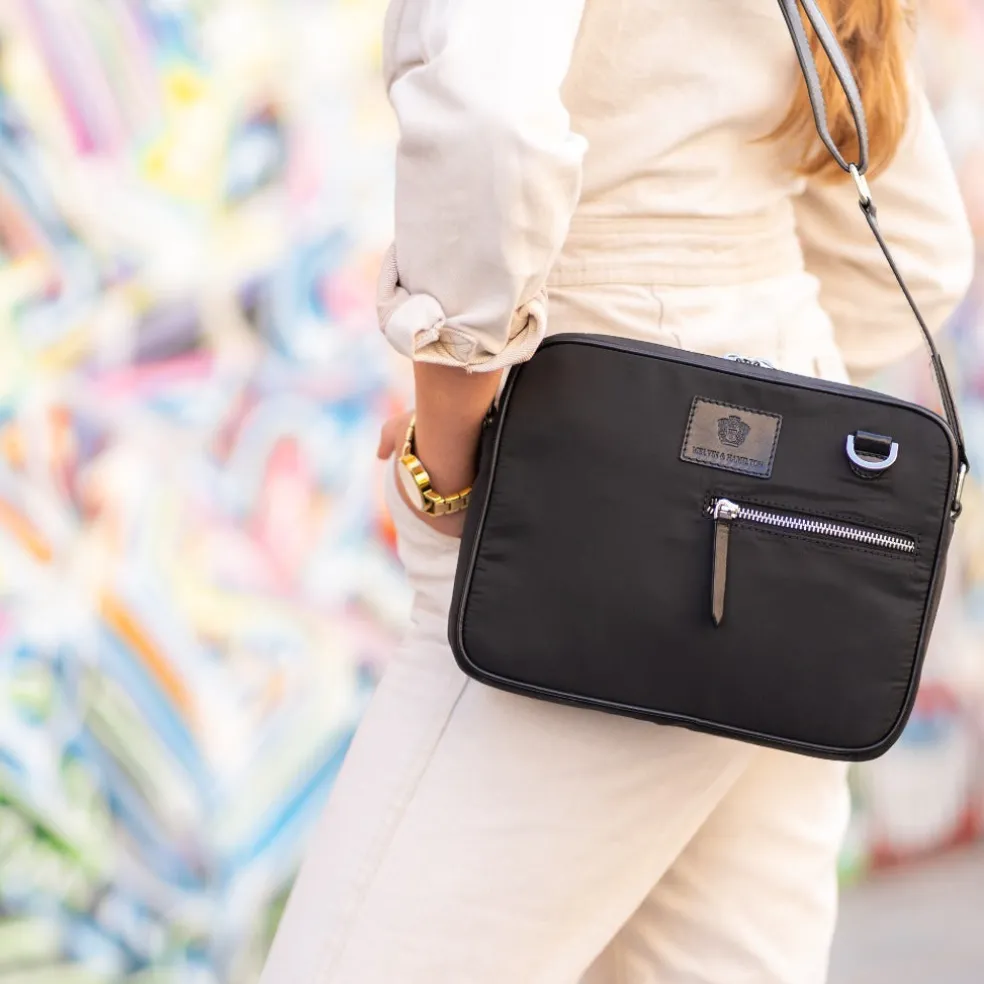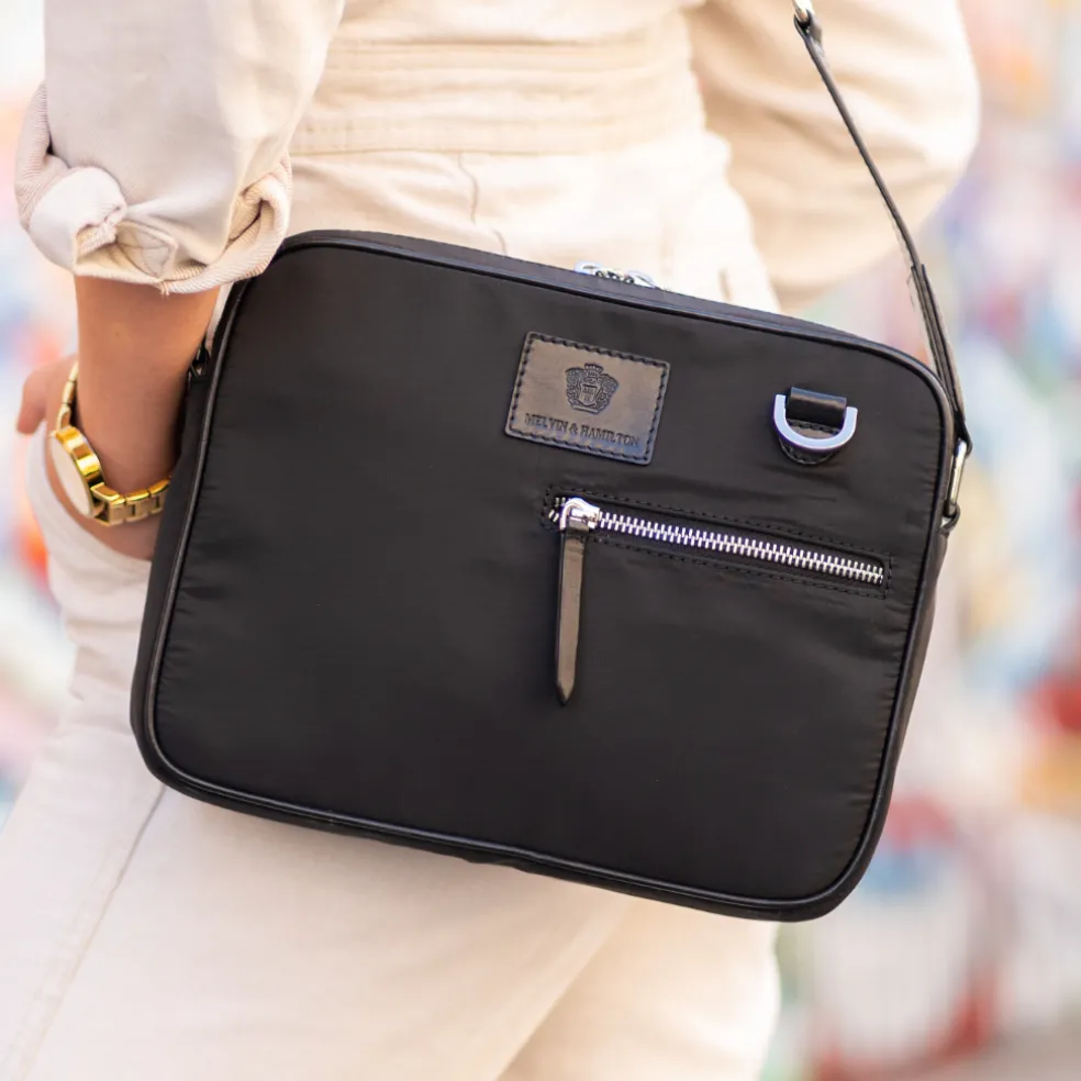 Vous cherchez un nouveau sac à main qui sorte de l’ordinaire ? Le sac à main noir Quebec dessiné par Melvin & Hamilton est le choix idéal ! Avec des dimensions généreuses pour y mettre de nombreux objets et effets personnels, ce sac en textile se distingue par son côté esthétique et fashion. Pouvant être porté à l’épaule, sous le bras ou en bandoulière, notre sac s’adaptera à toutes les envies en plus d’être pratique. La bandoulière en cuir de vache imprimé animal apporte une touche tendance et rock-chic à votre look. Il n’attend plus que vous !