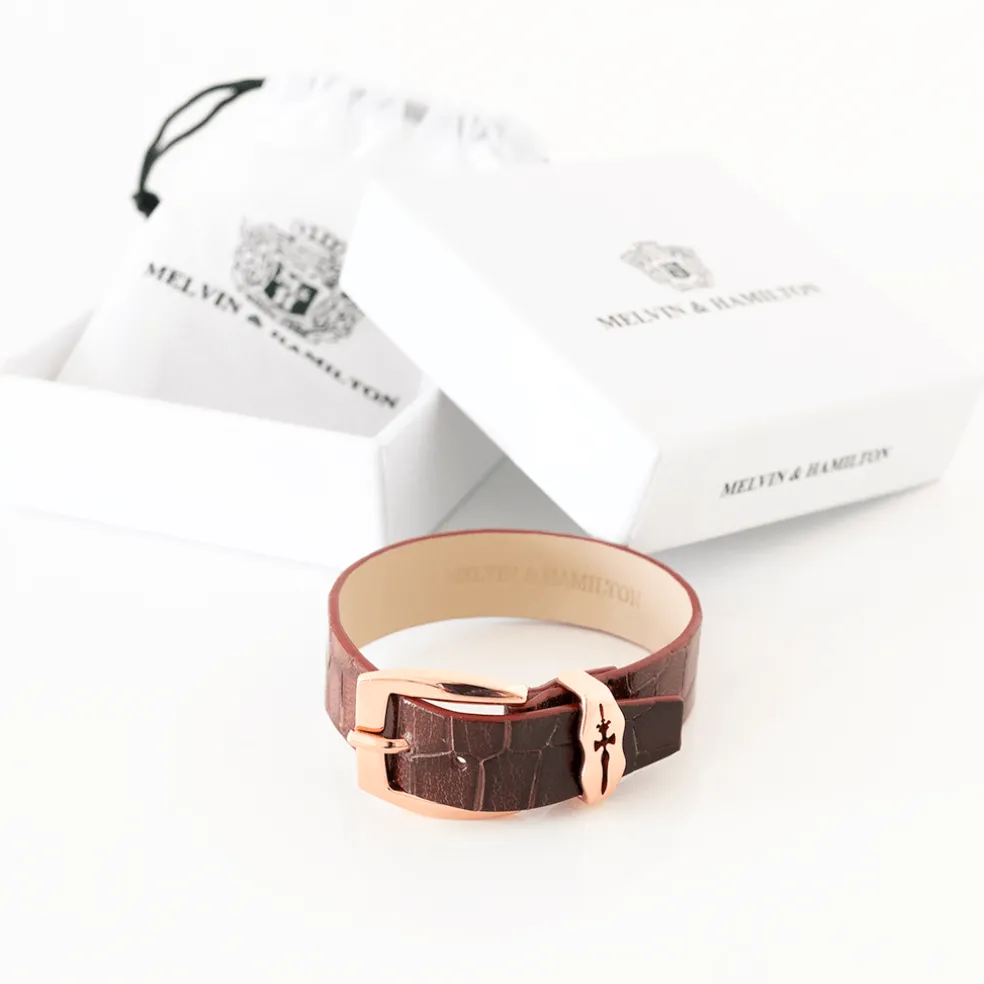 Les bracelets ne sont pas uniquement réservés aux dames ! Melvin & Hamilton vous propose un bracelet pour homme en cuir de haute qualité disponible dans de multiples coloris. Le bracelet Stark vous séduira pour son cuir marron imitation croco, ainsi que par sa boucle dorée. Mettez votre poignet en avant avec notre modèle Stark. Ne passez pas à coté de cet outil fashion !
